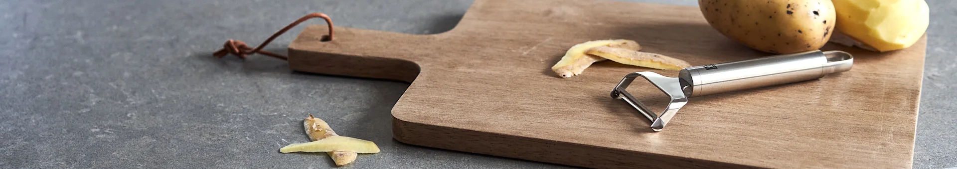 Na nossa vasta gama de ferramentas de cozinha, pode encontrar, entre outras coisas, descascadores de batatas de alta qualidade com um design inteligente que facilita a descasca de maçãs e batatas. Aqui pode encontrar descascadores de batatas de marcas bem conhecidas como Brabantia, Zwilling e Global.
