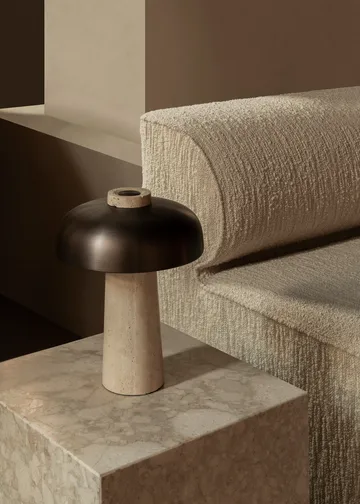 Candeeiro de mesa Reverse 30 cm da Audo Copenhagen tem um abajur arredondado em metal e uma base em pedra natural não trabalhada com uma forma que lembra um cone. Graças ao material bruto da base, surgem sombras impressionantes quando o candeeiro está aceso. Além disso, as diferentes tonalidades da pedra aparecem de maneira fascinante. Onde a base e o abajur se encontram no topo, há um dimmer que permite ajustar a intensidade da luz e a temperatura da cor ao mesmo tempo, o que faz com que o candeeiro atenda a muitas necessidades de iluminação diferentes – desde uma luz quente na mesa de cabeceira até uma luz suave na cômoda.