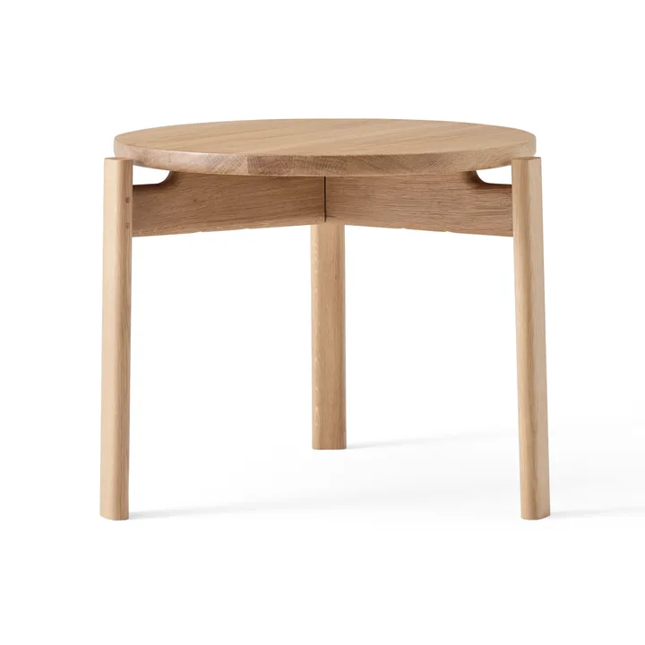 Mesa de centro Passage Ø50 cm da Audo Copenhagen é uma mesa redonda feita de madeira maciça certificada pelo FSC, desenhada com as formas primárias círculo e retângulo como ponto de partida. As formas suaves da mesa de centro redonda proporcionam uma impressão agradável que também oferece uma silhueta bonita. A forma e o tamanho fazem com que a mesa se adapte a espaços menores e maiores, como na frente do seu sofá ou ao lado de um par de poltronas.