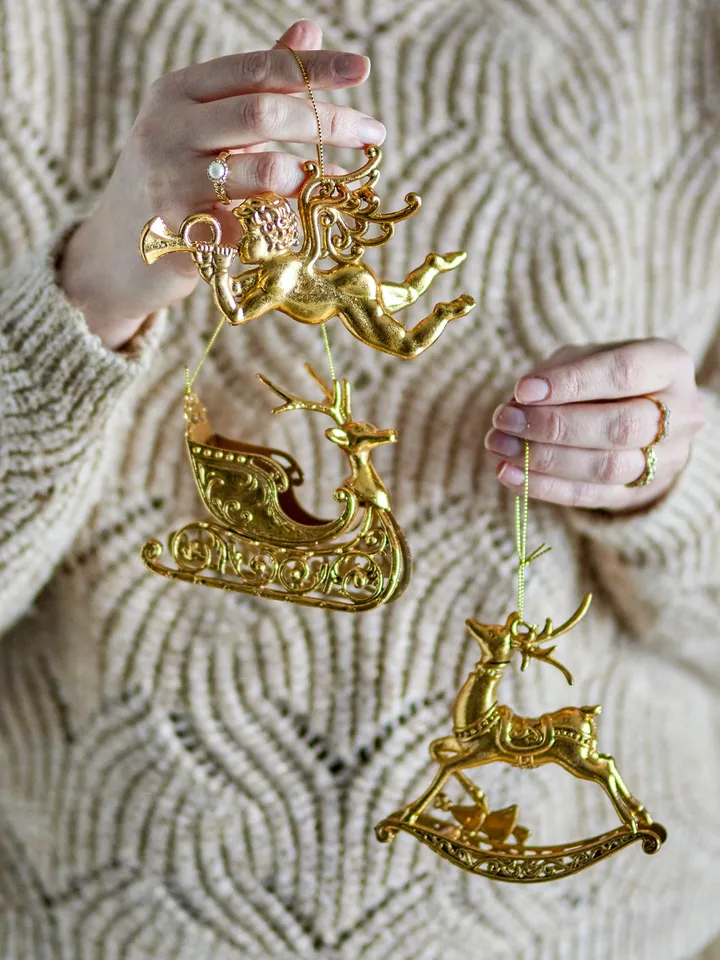 Enfeite de Natal Anisa 3 peças da Bloomingville é feito de poliestireno e consiste de um anjo, uma rena e um trenó. Estas decorações douradas têm designs bonitos e detalhados que enriquecem a sua celebração de Natal.