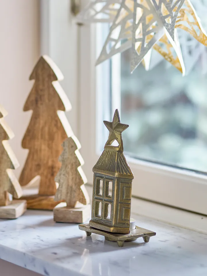 Porta-velas Crista 6x17 cm da Bloomingville é feito de alumínio e tem uma superfície semelhante ao latão. Formado como uma casa com uma estrela no topo, captura o espírito do Natal e espalha uma sensação festiva. Coloque uma vela de chá atrás para criar uma iluminação aconchegante e destacar os detalhes.