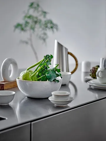 A tigela Addison 1,825 L da Bloomingville é uma generosa tigela de grés com esmalte branco rajado e uma borda de contraste marrom. Perfeita para servir saladas, pratos de massa ou snacks, combina funcionalidade com design elegante. Como cada tigela é única na forma, tamanho e cor, torna-se um elemento vivo na decoração da mesa.