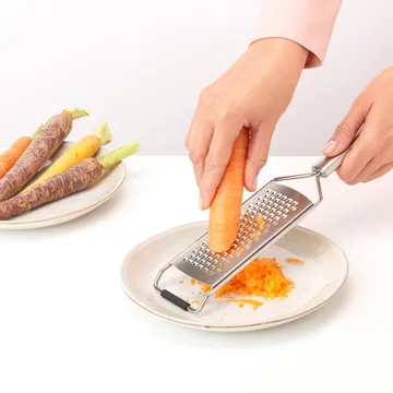 Ralador grosso Profile da Brabantia é feito de aço inoxidável de alta qualidade e é adequado para a maioria das coisas. O ralador elegante rala tudo, desde repolho e maçã até abobrinha e queijo macio, sem problemas. O cabo proporciona uma boa aderência e a grande placa, juntamente com o prático antiderrapante que você apoia contra a tigela ou tábua de corte, torna o ralar simples.