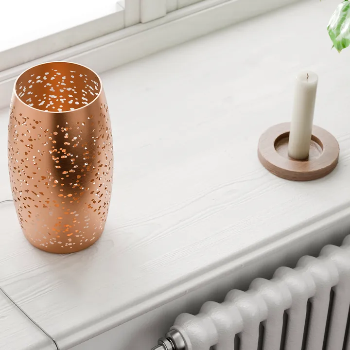 Candeeiro de mesa Colby da By Rydéns é um candeeiro elegante em metal mate com acabamento arenoso que confere um caráter quente e rústico. A superfície perfurada deixa a luz filtrar por pequenos orifícios decorativos, criando um brilho suave e envolvente ao seu redor. A forma simples do candeeiro é equilibrada pela textura viva, tornando-o tão bonito aceso como apagado. O candeeiro de mesa Colby da By Rydéns é um detalhe elegante que acrescenta forma e atmosfera ao ambiente.