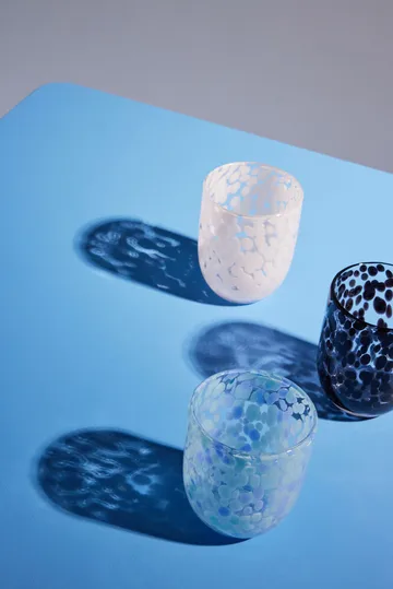 Messy copos 30 cl, 2 un. da Byon são fabricados em vidro soprado à mão com um padrão de confete divertido. Perfeitos para servir bebidas, sumo, leite ou café, mas também como porta-velas ou copo para escovas de dentes. Feitos à mão com diferenças únicas de cor e textura.