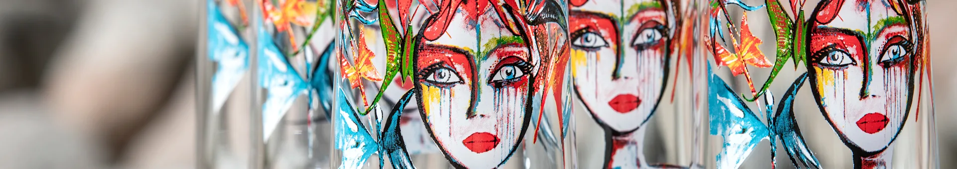 Os motivos coloridos dos copos e da porcelana representam retratos femininos. A inspiração para os motivos vem das mulheres que conheceu na sua vida e nas quais encontra inspiração e alegria. Os motivos comuns na arte de Carolina Gynning são borboletas e citações imaginativas e belas. Na série Make Peace, por exemplo, encontrará a poderosa citação "Faça as pazes com o seu passado para que ele não estrague o presente", que é uma boa citação para viver.