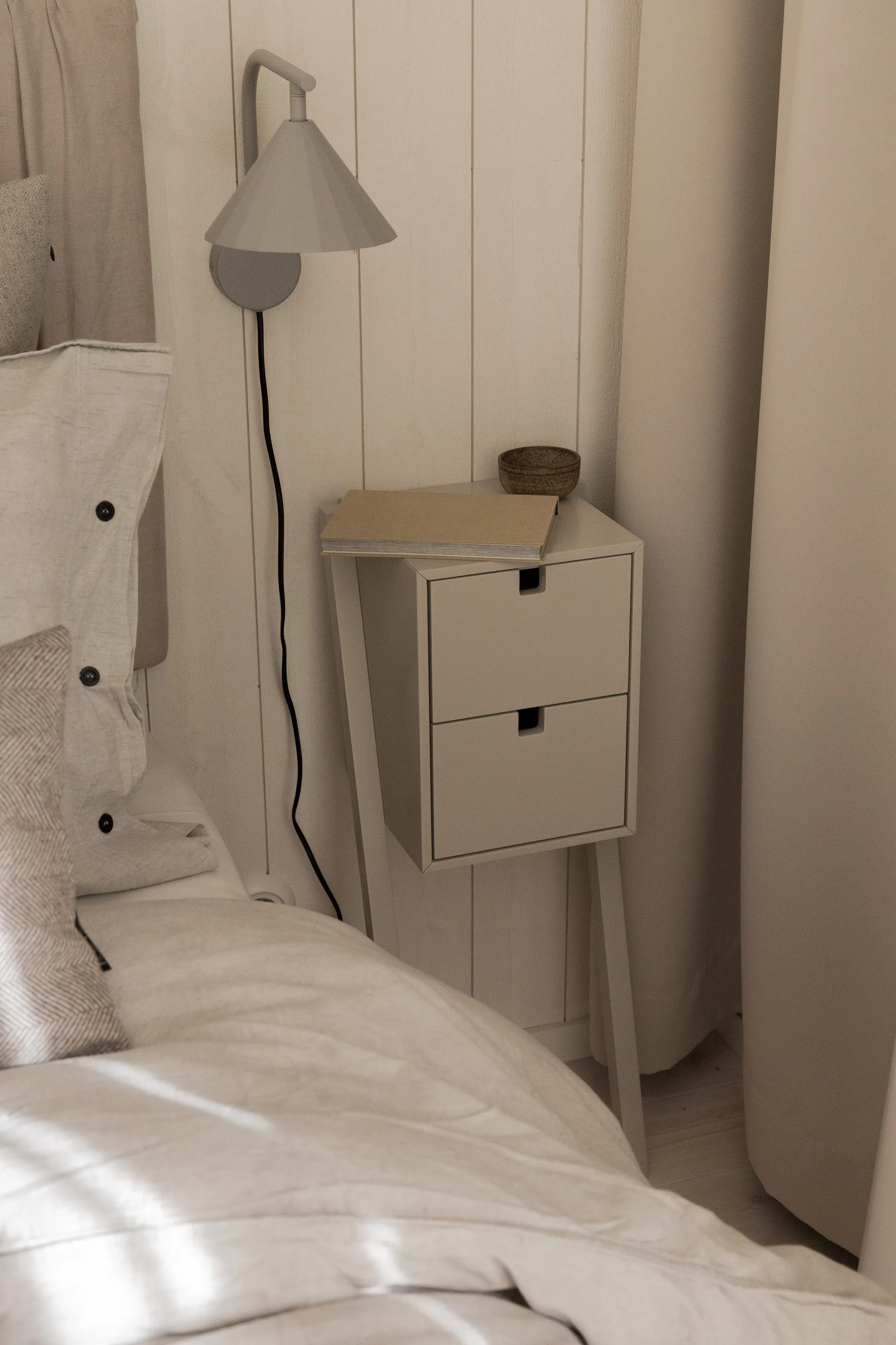 Candeeiro de parede Rain da sueca CO Bankeryd é uma lâmpada onde a combinação de linhas retas e formas arredondadas cria uma aparência equilibrada entre o minimalista e o lúdico. O design em forma de cone da cúpula lembra um guarda-chuva. A cúpula também é giratória, algo muito prático, por exemplo, para leitura.