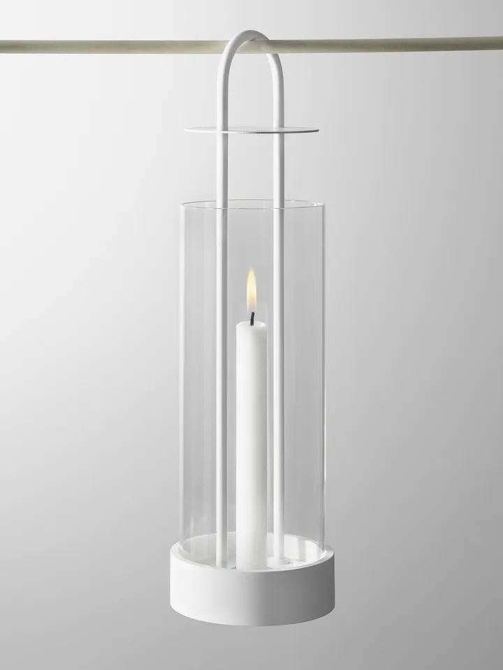 Lanterna hurricane Lotus da Design House Stockholm é uma lanterna moderna que pode ser usada com velas ou velas em bloco. Kristina Stark desenhou esta versão simplificada do clássico lampião de tempestade com alça.