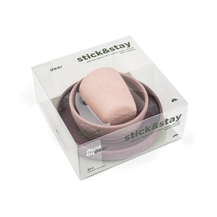 Louça de jantar para crianças Deer Friends Stick&Stay 3 peças da Done by deer é fabricada em 100% silicone. O conjunto inclui um prato, uma taça e uma mini caneca, todos com ventosas que os mantêm no lugar durante a refeição. A louça é adornada com detalhes adoráveis de Deer Friends, perfeita para pequenos comensais.