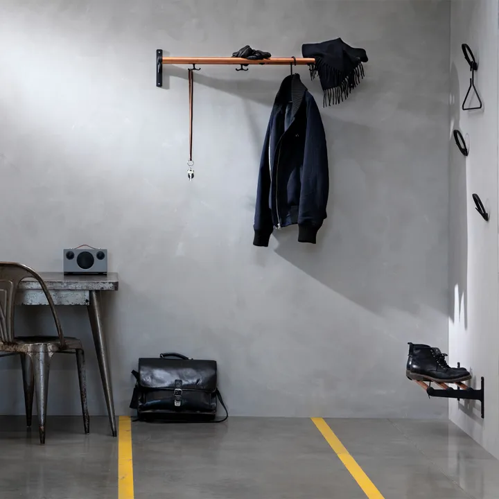 A sapateira ou porta-chapéus Nostalgia foi desenhada em 1937 por Gunnar Bolin. A prateleira pode ser utilizada tanto como sapateira quanto como porta-chapéus e tem aparecido e desaparecido ao longo das décadas, mas hoje é vista como um clássico na história do mobiliário sueco. Os suportes são feitos, agora como antigamente, de sucata de alumínio fundido que se junta com varão de madeira ou alumínio. A prateleira é fornecida com ganchos para ser usada como porta-chapéus. Recomendamos não colocar mais de dez cabides por metro de porta-chapéus. A prateleira pode ser prolongada com uma parte adicional e assim pode ter qualquer comprimento ou ser totalmente ajustada cortando os varões na medida desejada.