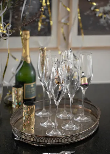 Copo de champagne Cabernet 29 cl 6-unidades da Holmegaard dinamarquesa são seis flûtes de champagne altas e estreitas com uma forma elegante. Os copos são desenhados por Peter Svarrer e oferecem uma experiência de bebida ideal tanto em sabor quanto em aparência. Os elegantes copos de champagne fazem parte da série Cabernet e podem ser combinados com outros copos para um conjunto bonito.