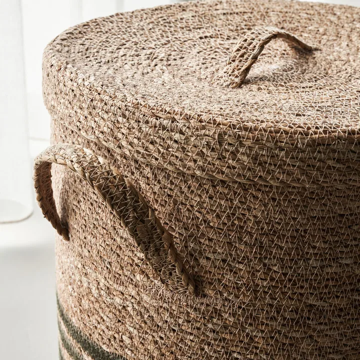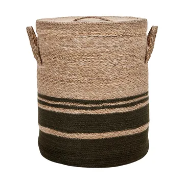 Cesto de arrumação com tampa Laundry, 2 peças da House Doctor é feito de juta e ervas marinhas. Este conjunto de duas peças oferece uma solução prática para manter a roupa organizada e escondida. As listras verde-escuras na parte inferior dão uma impressão de tranquilidade e ordem. Os cestos também podem ser usados para armazenamento extra na sala de estar ou no quarto. Série: Laundry.