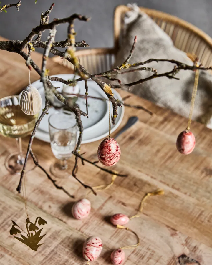 Enfeite de Páscoa ovos Marble 6 peças da House Doctor dá um toque sofisticado e moderno à decoração de Páscoa. Estes ovos feitos à mão têm um belo tom vermelho queimado e uma superfície semelhante ao mármore que cria uma sensação elegante e acolhedora. Os ovos de Páscoa podem ser pendurados em ramos ou combinados com outras decorações para um visual estiloso e coeso. Feitos de madeira, ferro e lurex para um detalhe de Páscoa durável e decorativo.