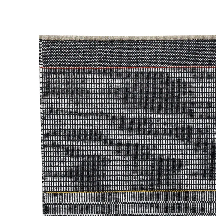 Um lindo tapete da série Tribulus One da Kateha por Hans Hosak. O tapete é tecido à mão em lã sobre urdidura de linho. Os grandes campos do tapete em preto e branco são separados uns dos outros por linhas finas em vermelho e amarelo. Um tapete de lã é durável e resistente à sujeira, sendo igualmente adequado para ambientes públicos e residenciais. Um tapete da Kateha é um verdadeiro trabalho artesanal de alta qualidade e com um design que perdura ao longo do tempo e espaço.