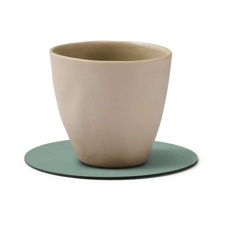 A base para copos reversível circular Cloud-Nupo 1 un. é um suporte de dupla face da LIND DNA, fabricado em couro reciclado e borracha. A base redonda para copos possui dois lados de cores diferentes, um verde e um cinza escuro, que você pode alternar. A base tem uma textura macia e fosca e, graças ao seu material, é tanto fácil de limpar quanto incrivelmente durável!