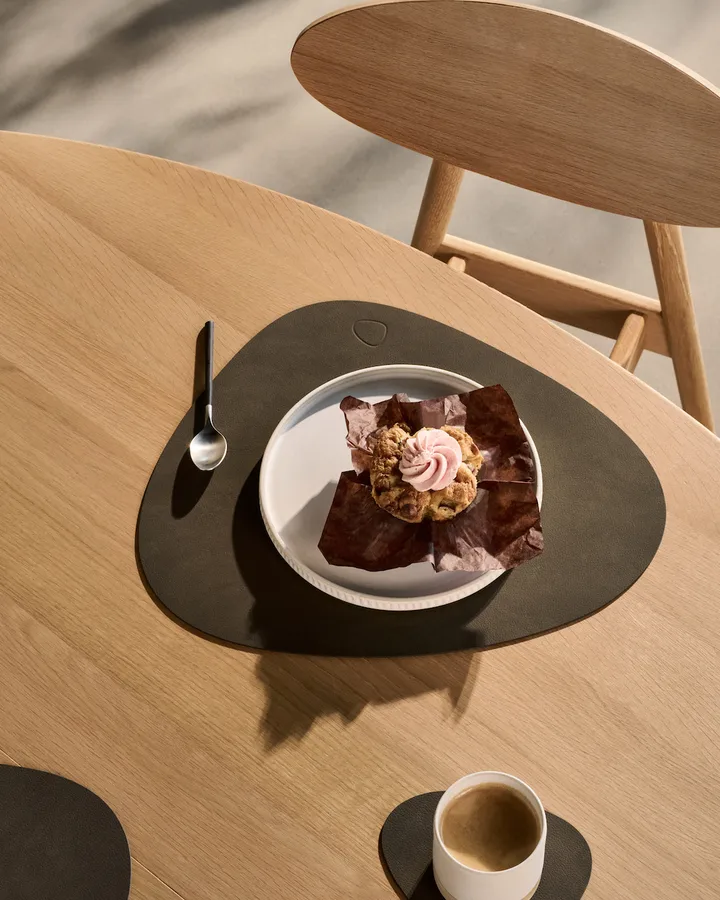 Nupo individual de mesa curva L da LIND DNA é um individual com uma forma ondulada e divertida que traz vida e movimento à mesa. A forma única chama a atenção e cria uma sensação acolhedora à volta da mesa. O individual é fabricado em couro reciclado e borracha natural — um couro granulado que proporciona uma superfície durável, resistente a sujidade e água, fácil de limpar. Perfeito para jantares do dia a dia e ocasiões mais festivas em que pretende realçar a expressão da mesa.