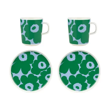 Conjunto de pequeno almoço Unikko da empresa finlandesa Marimekko é composto por duas canecas e dois pratos de cerâmica com o famoso padrão Unikko desenhado por Maija Isola na década de 1960. A forma das canecas e dos pratos, por sua vez, foi criada por Sami Ruotsalainen. O conjunto florido é ideal tanto para o lanche com amigos quanto para o café da manhã com a família.