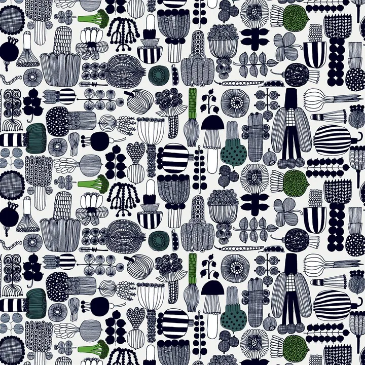 Com padrões de legumes, flores e cogumelos, Maija Louekari capturou o verão nesta maravilhosa toalha impermeável da Marimekko. O tecido de algodão revestido com acrílico é mais flexível e tem uma superfície mais fosca do que a antiga versão com revestimento de PVC.