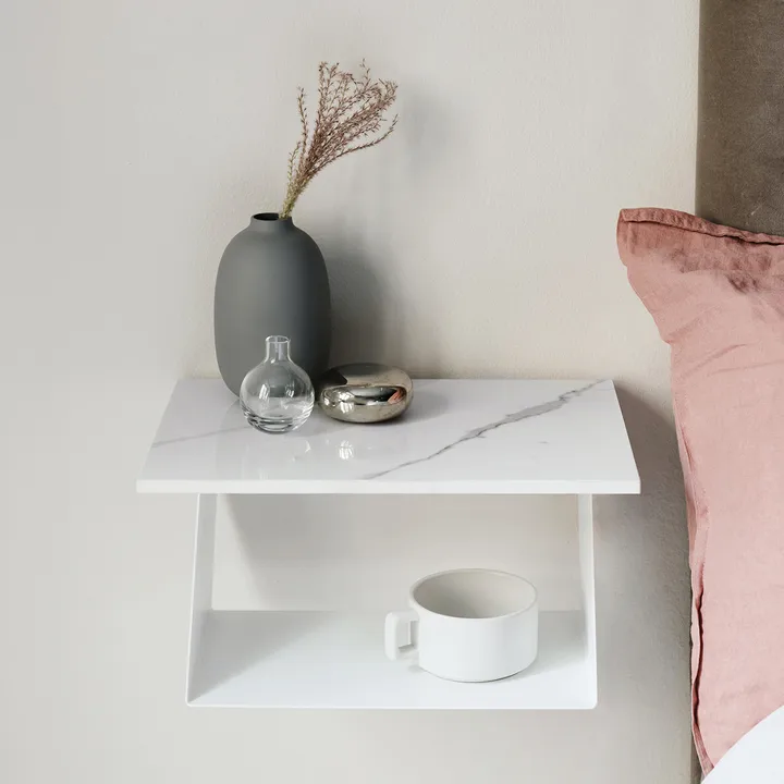 Estante Edgy Edition da Maze sueca é uma versão um pouco mais luxuosa da mesa de cabeceira Edgy com seu tampo em cerâmica durável semelhante a mármore. O tampo é feito de material reciclado e é extremamente resistente a riscos, manchas, produtos de limpeza e calor. Xícaras de chá quentes ou luz solar intensa não são problemas, em outras palavras, nem para a cor nem para a estrutura.