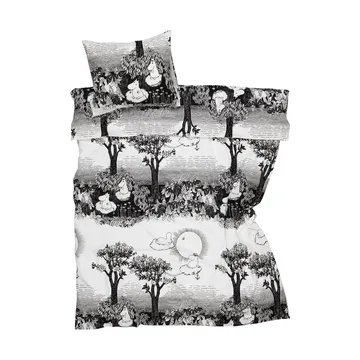 Conjunto de cama Moomin 150x210 cm da Moomin Arabia é um conjunto de cama com capa de edredão e fronha fabricadas em algodão orgânico. Crie beleza no quarto e durma bem em lençóis macios adornados com motivos do mundo mágico dos Moomins.