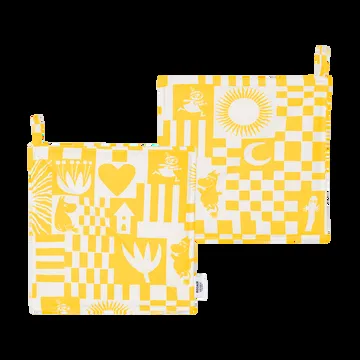 Conjunto de pegas Moomin Party 22x22 cm 2 unidades da Moomin Arabia é feito de 100% algodão orgânico e decorado com motivos clássicos de Moomin dos anos 1950. Estas coloridas pegas de algodão são tanto práticas quanto lúdicas – perfeitas para criar uma atmosfera alegre e inspiradora na cozinha.