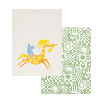 Moomin Party pano de cozinha 50x70 cm conjunto de 2 da Moomin Arabia é feito de 100% algodão orgânico e traz ao seu espaço uma sensação de verão e diversão. Os padrões coloridos dos Moomin, inspirados pelo design de Tove Jansson da década de 1950, tornam cada momento de cozinha um pouco mais divertido. Os panos de cozinha combinam qualidade com sustentabilidade e são um detalhe encantador na decoração da sua cozinha.