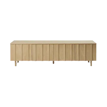 Aparador baixo Rib da Normann Copenhagen é fabricado em folheado de carvalho lacado e madeira maciça. Inspirada no design escandinavo das casas de verão nórdicas dos anos 1960, a coleção Rib apresenta painéis de madeira trapezoidais que conferem uma estética intemporal e cheia de carácter. O aparador Rib está disponível em carvalho ou acabamento preto suave e combina durabilidade com um estilo minimalista e natural. Use-o na sala de estar para guardar livros e objetos decorativos, ou na sala de jantar como uma solução de armazenamento elegante para porcelana e vidro.