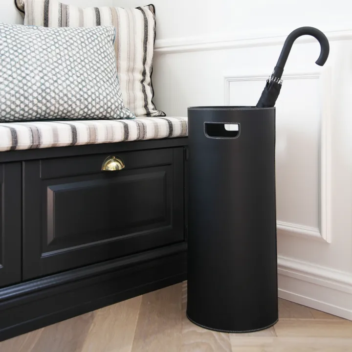 Dê aos seus guarda-chuvas um armazenamento elegante com o inteligente e estiloso Ørskov porta chapéus de chuva. O suporte é feito de couro preto com delicados pontos brancos e está equipado com uma alça prática que facilita o deslocamento. Coloque o porta chapéus de chuva no hall e combine-o com outros bonitos produtos de armazenamento da Ørskov!