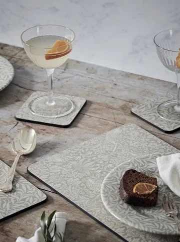 Base para copos Strawberry Thief, 6 un. da Pimpernel são seis bases para copos quadradas em cortiça com um padrão detalhado em forma de pássaros entre morangos e belas flores desenhadas por William Morris. As bases para copos são perfeitas tanto para o copo de suco no café da manhã quanto para o copo de vinho no jantar.