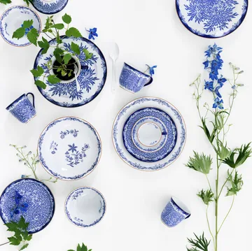 Caneca Ostindia Floris, 2 un. de Rörstrand é desenhada por Caroline Slotte e Anna Lerinder. A caneca Ostindia Floris é um clássico moderno e a inspiração de seu irmão mais velho Ostindia é evidente. Ostindia Floris tem a mesma bela cor de Ostindia e um padrão com folhagens que cobre a caneca. Crie uma mesa romântica e clássica misturando porcelanas de toda a família Ostindia!