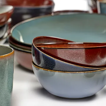 Tigela pequena, esmaltada da série Terres de Rêves desenhada por Anita Le Grelle para Serax. O esmalte reativo dá a cada tigela uma aparência completamente única. A tigela pequena é perfeita para nozes, azeitonas e deliciosos molhos. A ideia para a louça de grés surgiu por acaso quando Anita desmontou uma de suas antigas obras de arte em argila. As partes desmontadas da escultura em forma de torre formaram a base para a louça de grés Terres de Rêves. Com o tempo e a crescente demanda, a coleção foi expandida e hoje inclui copos, canecas, pratos, tigelas e bandejas em uma variedade de tamanhos, formas e cores. Misture e combine com outras peças da louça de grés Terres de Rêves ou mantenha-se em uma ou duas cores para um visual mais coeso.
