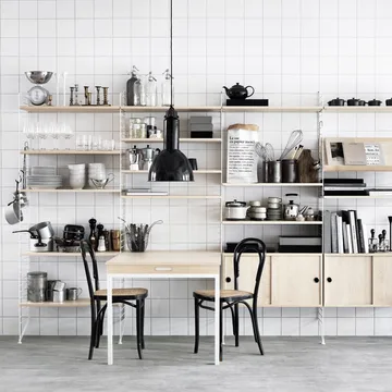 Mesa dobrável String da String furniture é uma mesa flexível que pode ser facilmente colocada numa cozinha pequena ou noutros espaços apertados onde há menos espaço para uma mesa permanente. Porque não usá-la como local de trabalho durante o dia e como mesa de jantar à noite? A mesa dobrável é compatível apenas com painéis laterais com uma profundidade de 30 cm.