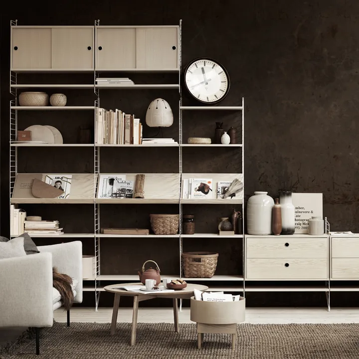 Prateleira String da String, desenhada por Nisse Strinning, faz parte do flexível String System. Oferece uma variedade de combinações com os seus icónicos painéis de arame. Personalize a prateleira conforme necessário e crie uma solução de armazenamento pessoal.