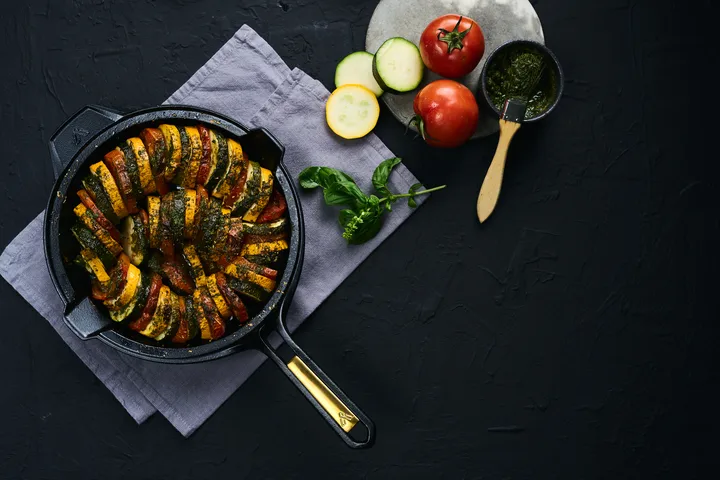 Frigideira Signature ferro fundido polido 25 cm. Frigideira Signature em ferro fundido polido da Victoria. Excelente retenção e distribuição de calor. Esta frigideira temperada mantém a comida quente por mais de 15 min. Temperada com 100% óleo de linhaça certificado kosher, livre de PTFE, PFOA e outras substâncias químicas. A pega mantém-se mais fria por mais tempo no fogão e proporciona uma manipulação segura. Superfície usinada CNC com microtextura para tempero óptimo.