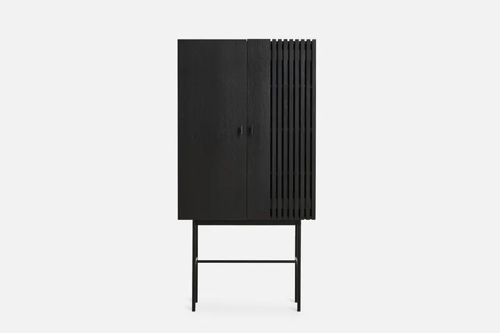 Armário Array, 80 cm da dinamarquesa Woud é um armário elegante e bonito com armazenamento funcional. Como o design de uma das portas não é totalmente coberto e é feito de ripas de madeira, permite-se ter um vislumbre do que está escondido dentro. Este design dá toda a expressão ao armário alto que, fundamentalmente, tem uma forma simples e elegante. As pernas esbeltas feitas de metal elevam todo o móvel de madeira e criam um bonito contraste entre os diferentes materiais.
