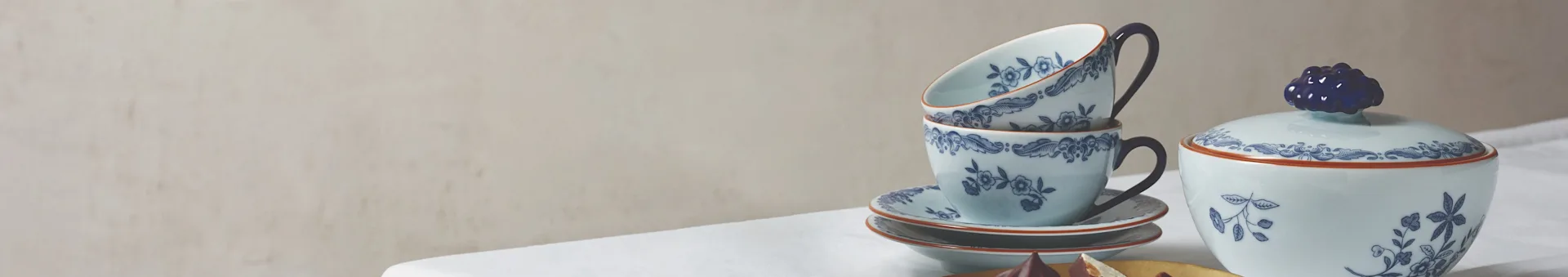 A popular série Ostindia da Rörstrand oferece um design intemporal onde pode combinar as suas chávenas de chá e canecas de chá com um bule, mas também pratos de bolo, pratos e tigelas, nas cores clássicas da série, o azul e o branco.