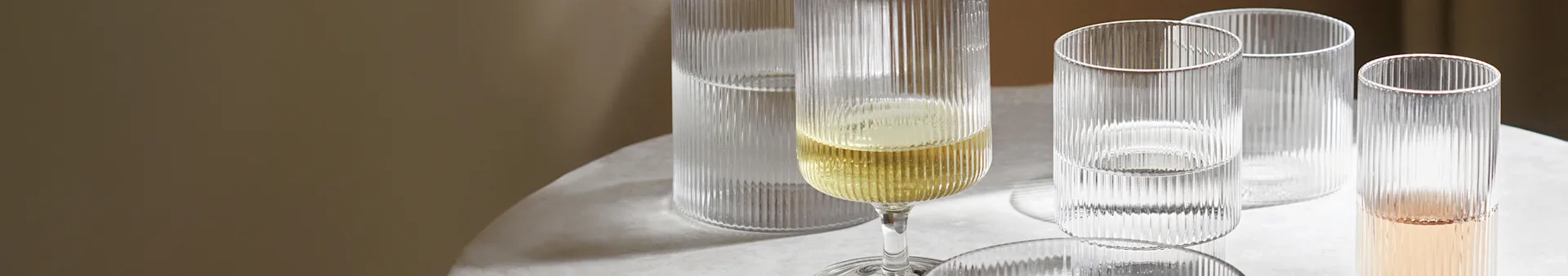 Por exemplo, a coleção de vidraria Ripple da Ferm Living inclui copos de champanhe, copos de vinho, copos de bebida longa e mais, todos feitos de belo vidro soprado à boca com uma elegante superfície de vidro estriado.