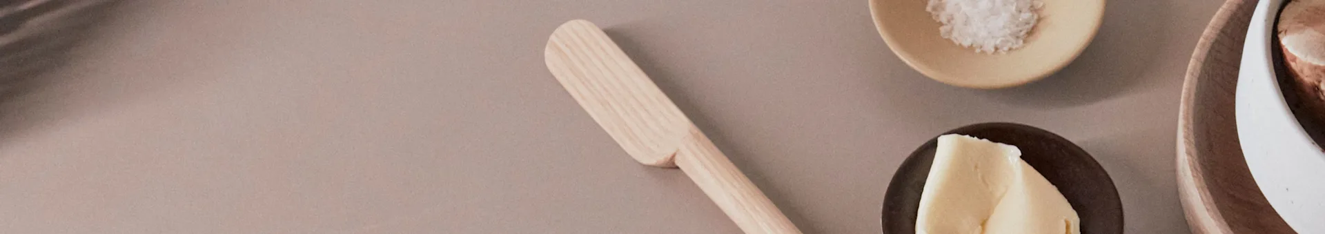 As facas de manteiga de madeira começaram a ser vendidas depois das facas de manteiga de metal. Uma faca de manteiga de madeira é muito durável e tem um toque agradável. Para manter a cor fina da madeira e evitar a secagem, pode olear as suas facas de manteiga de madeira. A MUUBS tem facas de manteiga em teca que são tão confortáveis de segurar como de olhar.